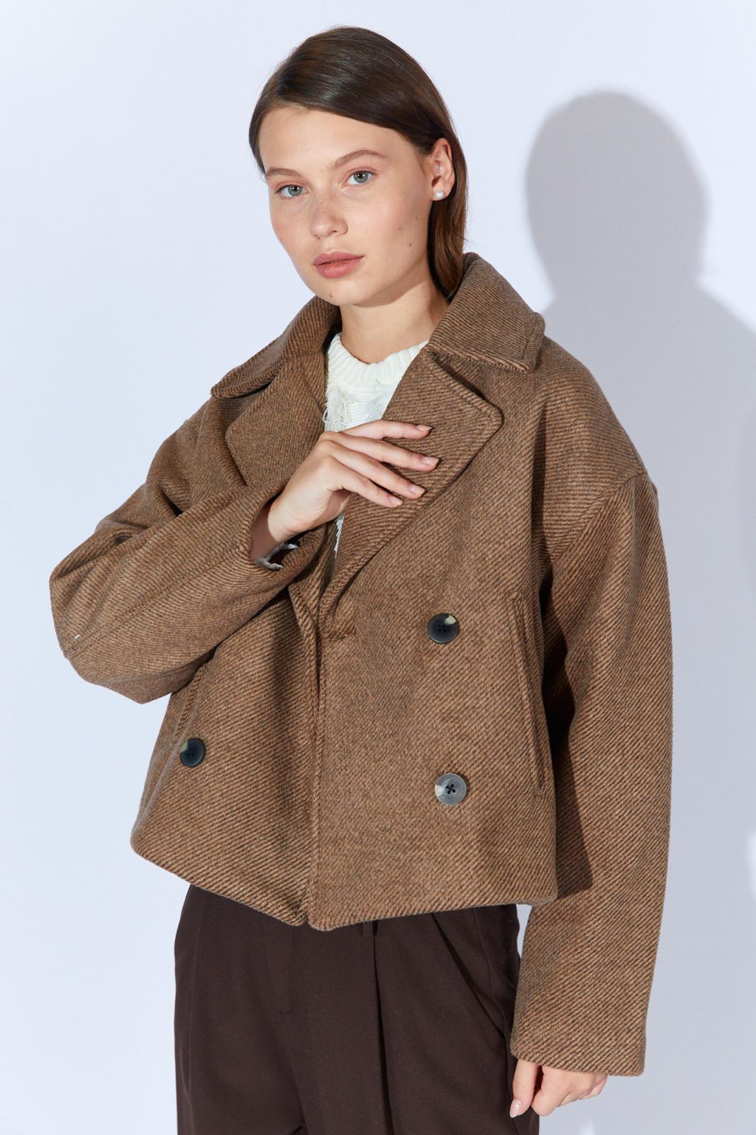 Yakalı Dört Düğmeli Diagonel Kısa Kaşe Ceket